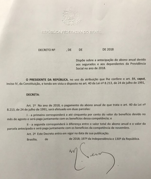 No passado, Temer editou decreto semelhante, atencipando a primeira parcela do 13º.